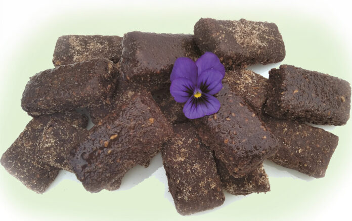 - Mix 2 -3 Tbsp carob powder into the coconut fines to colour it.