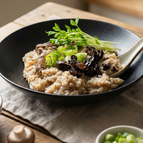 The slow simmer transforms the rice into a soft, velvety texture without the need for oil. A splash of low‑sodium soy sauce or tamari seasons the porridge with mineral‑rich depth, while nutritional yeast adds a gentle savoury note and a boost of B‑vitamins. Finished with fresh spring onions, toasted sesame seeds, and marinated mushrooms and sliced nori sheets, each bowl delivers a balance of comfort, aroma, and clean flavour.
