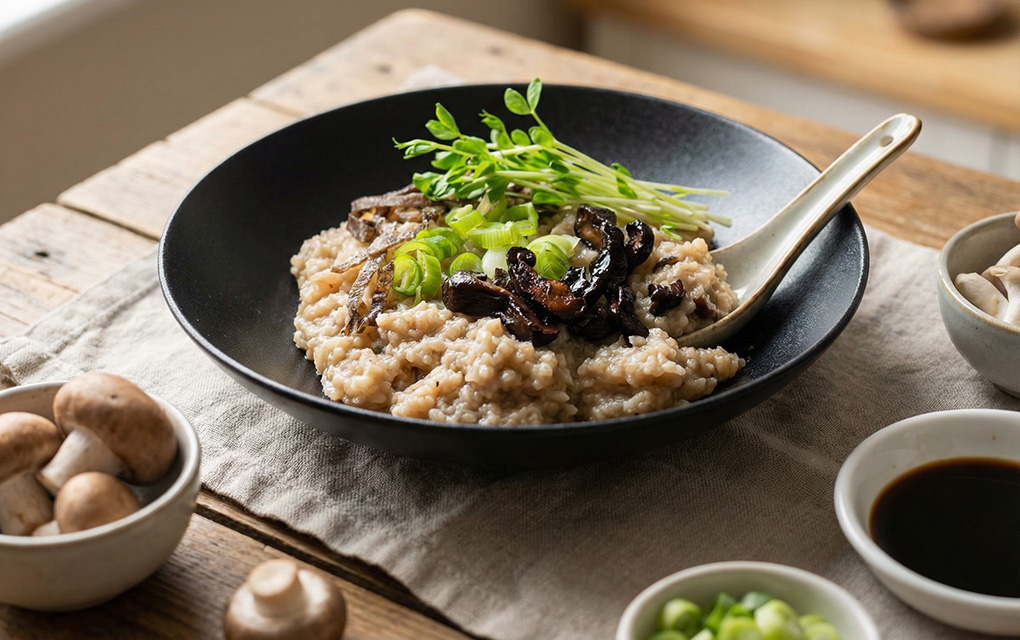 The slow simmer transforms the rice into a soft, velvety texture without the need for oil. A splash of low‑sodium soy sauce or tamari seasons the porridge with mineral‑rich depth, while nutritional yeast adds a gentle savoury note and a boost of B‑vitamins. Finished with fresh spring onions, toasted sesame seeds, and marinated mushrooms and sliced nori sheets, each bowl delivers a balance of comfort, aroma, and clean flavour.