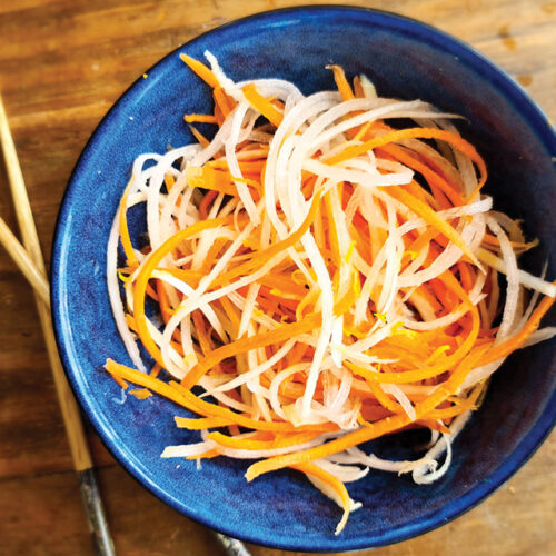 A traditional Japanese dish celebrated for its bright flavours, crisp texture, and wholesome ingredients. Made with thinly sliced daikon radish and carrots—two root vegetables known for their nutritional value—this salad offers a refreshing crunch, balanced by a light and flavorful dressing of rice vinegar, pure maple syrup, and a touch of water, finished with fragrant lemon zest. The result is a harmonious blend of sweet, tangy, and citrus notes that awaken the palate and complement a wide range of main dishes.