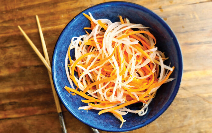 - Squeeze excess water from the daikon and carrot and put them into the bowl with the dressing.