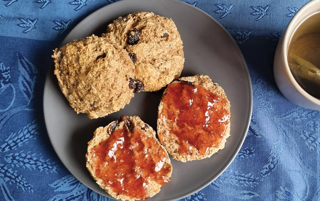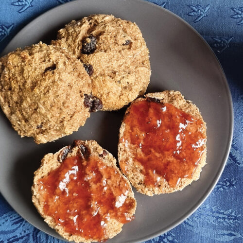 These golden, gently spiced scones are a celebration of simple, nourishing ingredients. Made with wholemeal flour for sustained energy and digestive support, they’re naturally sweetened with fruit—raisins or dates—and bound together with unsweetened apple sauce and plant milk or aquafaba, keeping them light, moist, and completely oil-free.
