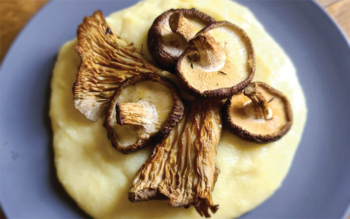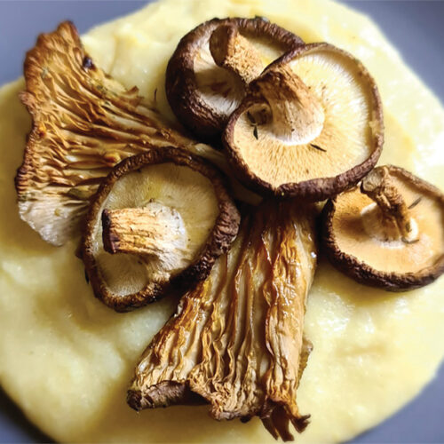 A rich yet wholesome plant-based dish that combines smooth, golden polenta with a savoury topping of wild mushrooms, garlic, thyme, and sage. The polenta is gently simmered in water, soy milk, and vegetable stock, then enhanced with nutritional yeast for a creamy, dairy-free “cheesy” flavour. The wild mushrooms—such as oyster and shiitake—are thinly sliced and sautéed until tender, releasing their earthy, umami notes, while fresh sage and thyme add a touch of aromatic warmth. A splash of red wine vinegar lifts the flavours with a subtle tang, balancing the richness of the dish.