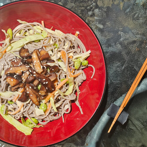 - Toss noodles with cabbage, carrots, edamame and dressing. Add mainated mushrroms, sliced chilli and/or sesame seeds, serve chilled or at room temperature.