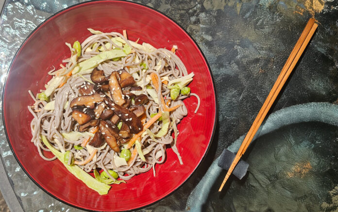 - Toss noodles with cabbage, carrots, edamame and dressing. Add mainated mushrroms, sliced chilli and/or sesame seeds, serve chilled or at room temperature.