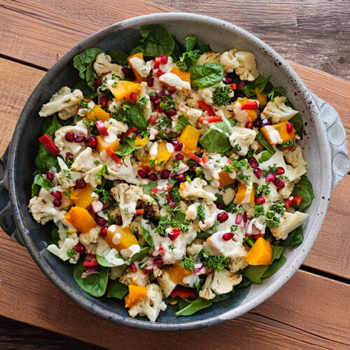 This wholesome salad combines the earthy crunch of lightly cooked cauliflower florets with the natural sweetness of roasted pumpkin, all nestled on a bed of fresh baby spinach. Thinly sliced red onion adds a sharp bite, while optional chickpeas bring extra protein and heartiness. The star of the dish is the creamy, oil‑free lemon tahini dressing, which blends nutty sesame paste with bright citrus, garlic, and warming spices for a flavour that is both rich and refreshing. Finished with garnishes like toasted almonds or pine nuts, jewel‑like pomegranate seeds, and fresh parsley, this salad is as visually stunning as it is nourishing.