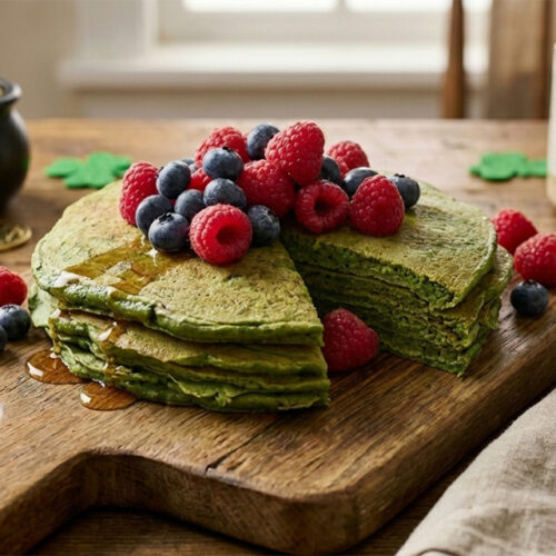 These naturally emerald‑green pancakes bring a burst of colour and vitality to your St Patrick’s Day table. Blending fresh baby spinach with ripe banana and warm vanilla creates a batter that’s silky, lightly sweet, and beautifully aromatic. Once cooked, the pancakes turn soft, fluffy, and tender—almost cake‑like—yet still feel clean and wholesome thanks to the oat or whole‑wheat base. They’re festive without food colouring, fun without fuss, and nourishing enough to enjoy any day of the week.
