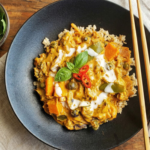 A fragrant, creamy red curry simmered with tender Thai eggplant, sweet butternut squash, shiitake mushrooms, and crisp garden vegetables. Enriched with silky cashew cream and brightened by bamboo shoots and snow peas, this nourishing Thai‑inspired dish delivers a perfect balance of heat, aroma, and wholesome comfort.