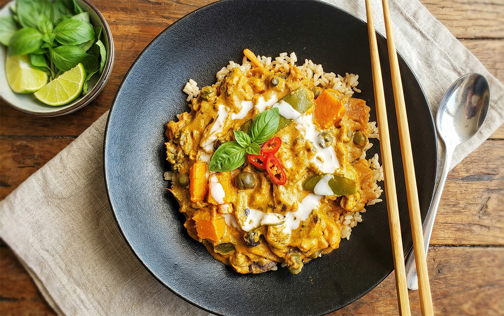 A fragrant, creamy red curry simmered with tender Thai eggplant, sweet butternut squash, shiitake mushrooms, and crisp garden vegetables. Enriched with silky cashew cream and brightened by bamboo shoots and snow peas, this nourishing Thai‑inspired dish delivers a perfect balance of heat, aroma, and wholesome comfort.