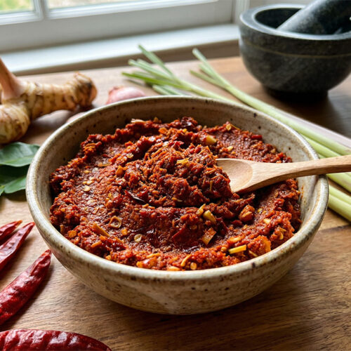 This pure WFPB red curry paste blends dried chillies, lemongrass, ginger, and warm spices into a smooth, aromatic base. Oil‑free, clean, and perfect for curries, soups, and marinades.