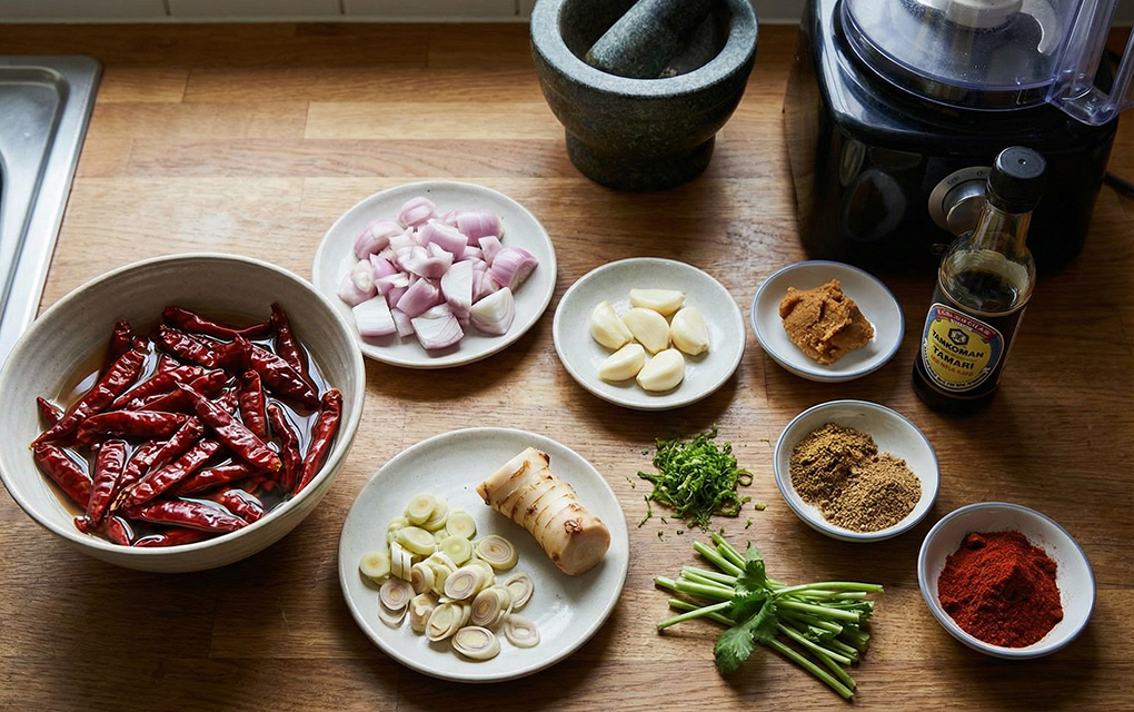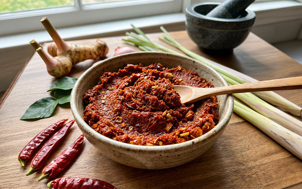 This vibrant, oil‑free red curry paste is made entirely from whole aromatics, toasted spices, and fresh herbs, delivering deep Thai flavour without relying on processed ingredients. Softened dried chillies bring gentle heat and natural antioxidants, while lemongrass, ginger, and garlic layer in brightness and warmth. These classic aromatics aren’t just flavour builders—they’re known for supporting digestion, circulation, and overall vitality in everyday cooking.